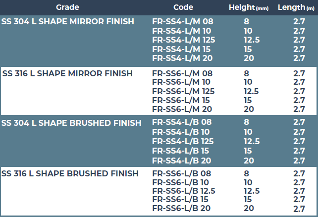 STAINLESS STEEL (L) SHAPE PROFILE FOR WALLS & FLOORS